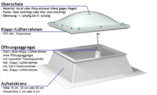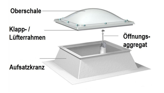 - Zubehör: Aufsatzkranz, Klapp-/Lüfterrahmen, Absturzgitter, RWA-Antriebe, Elektromotoren,