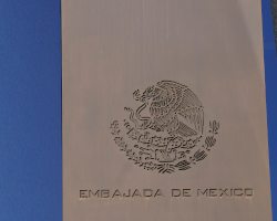 Für den Eingangsbereich laserte rotec aus einer 8 × 1300 × 2000 mm Messingtafel den Schriftzug “EMBAJADA DE MEXICO” mit Logo. Diese Messingtafel musste zunächst extra in der Schweiz gefertigt werden, da die Oberfläche eine ganz besondere Struktur aufweisen sollte. Beim Laserschneiden durfte dann kein Fehler passieren, da es sich um ein Unikat mit mehreren Monaten Lieferzeiten handelte. Die Einstellungen des Laser wurden mehrfach justiert und angepasst, um den Wunsch des Planers und Architekten erfüllen zu können.